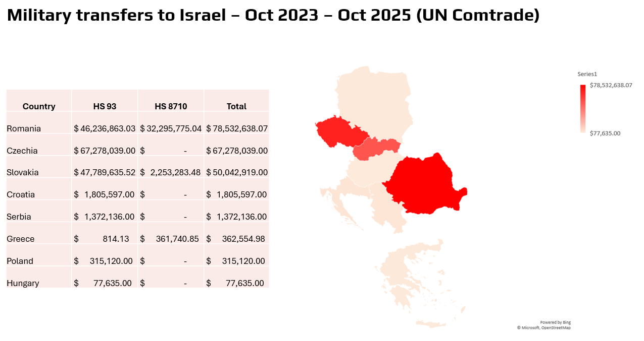 Potrivit datelor din baza UN Comtrade, între octombrie 2023 și octombrie 2025, echipamente militare în valoare de cel puțin 200 de milioane de euro au fost transferate din Europa de Est către Israel. Principalele țări implicate sunt România, Cehia și Slovacia, urmate, într-o măsură mai mică, de Croația, Serbia, Grecia, Polonia și Ungaria.