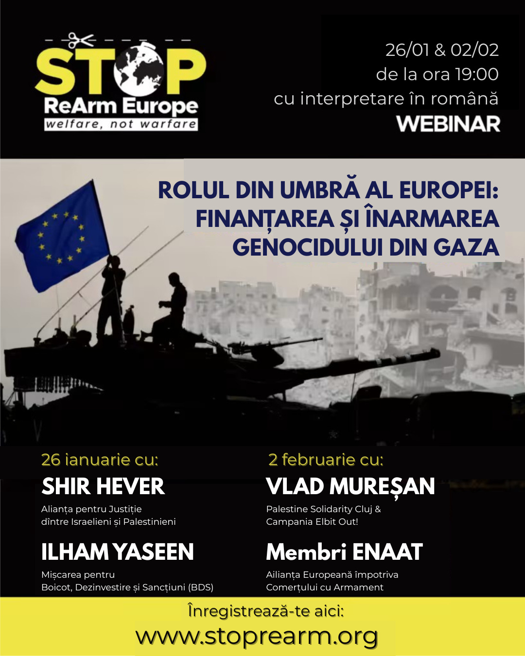 Mișcarea europeană STOP ReArm Europe organizează în datele de 26 ianuarie și 2 februarie 2026, de la ora 19:00 (ora României) două webinare care adresează complicitatea europeană la genocidul comis de Israel în Gaza și la ocupația militară a Palestinei, în special prin comerțul cu arme și consolidarea cooperării militare și modul în care societatea civilă se organizează pentru a contesta aceste politici.